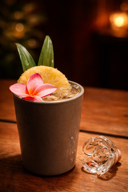 Gran Casala Reposado Chartreuse Amarillo Zumo de Piña a la Parrilla Sirope de Canela Zumo de Limón Amarillo Amargo de Angostura Piña Deshidratada Hojas de Piña