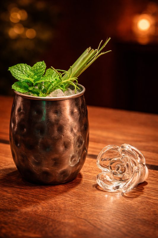 STEP 1: ADD THE INGREDIENTS TO THE COPPER CUP. STEP 2: INTEGRATE WITH A BAR SPOON. STEP 3: ADD TIRTURADO ICE. STEP 4: INTEGRATE AGAIN WITH THE BAR SPOON. STEP 5: DECORATE WITH MINT WREATH, LEMONGRASS LEAVES, AND ASTROMELIA. STEP 6: SERVE.